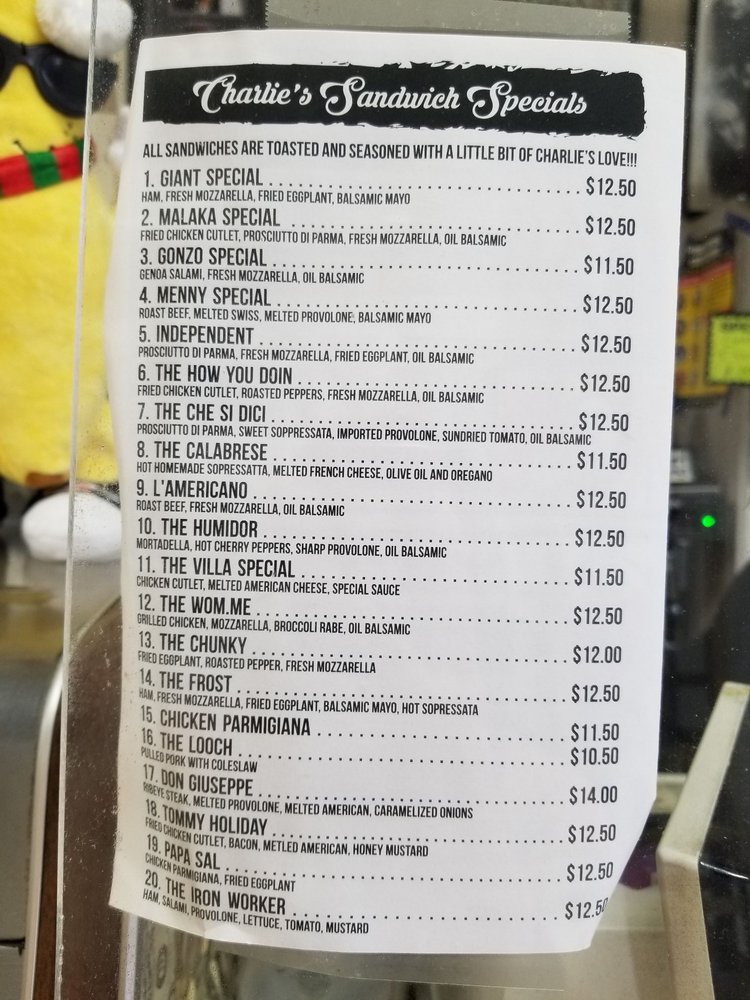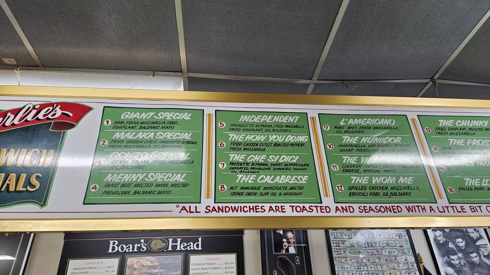 Welcome to Charlie’s Sandwich Shop, a hidden gem in Brooklyn offering a plethora of mouth-watering sandwiches. From the daily specials like BBQ Meatballs on Mondays to the unique Charlie's Special Sandwiches like the Malaka with fried chicken cutlet and prosciutto di Parma, there is something for everyone here. Customers rave about the tender roast beef and the perfectly crafted sandwiches made with love. The shop's cozy atmosphere, friendly service, and authentic Italian flavors create a dining experience you won't forget. Make sure to try their build-your-own sandwich option for a personalized touch. With a diverse menu, fresh ingredients, and impeccable service, Charlie’s Sandwich Shop is a must-visit for any sandwich enthusiast.